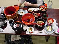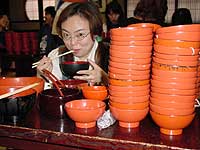 | 名物「わんこそば」に挑戦しました。季節柄、満開の石割さくらの余韻を引きずったままなだれ込む。時間が早かったか若い衆のグループが3組程度。オネエチャンの音頭でさっそく開始。9種の薬味が付くが、違いを楽しむ閑などまったく無く、ひたすらそばを啜り込む。「ドンドン」「もう一つ」などの囃子に乗せられ懸命にがんばるが90杯でギブアップ。同行の娘は30杯をたいらげ満足そう。旅の後半でもあり、体調不十分を理由に納得。通常なら150杯は軽いと思われる。 |
