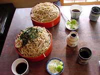 | 上田市「刀屋」:地酒屋のおかみに、池波正太郎の愛した「刀屋」を教えてもらいました。ここは、量が半端でなく、小・中・並・大と書いてある。先ほど「おお西」で食べたばかりで「そば湯」も飲みすぎたが、見栄をはり並を発注、同行者は中とひかえめ。写真の手前が並で奥が中である。他店なら二杯分はゆうにあり、小にすべきだったと反省しながらも、とにかくたいらげる。空腹時にもう一度味わいたい店である。 |