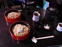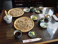 | 長野県信濃町 そば工房「若月」:折からの雪景色の中で新そばを味わう。この店ではおかみの手打ちが売りで、旨い漬物にシンプルな付け汁、のど越しのよいそば。旨さの基準とするには丁度よい。薬味のねぎを入れすぎないこと。 |