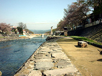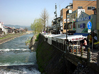 町並みには老舗の商店が立ち並び、歴史を感じさせます。朝市の喧騒から離れ、宮川の川原に一服の清涼を感じる。