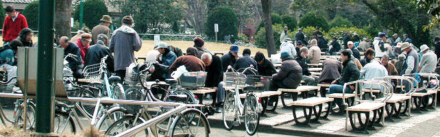 普選壇の前は将棋、囲碁、麻雀愛好家で一杯、それぞれの春の楽しみ方がある。