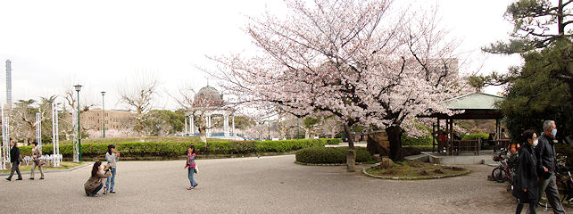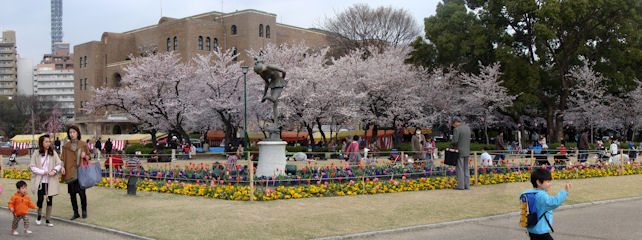やっと春が来た。名古屋の桜の名所の一つ鶴舞公園は七分咲き。桜の木の下は既にブルーシートで一杯だ。今日、日中はにわか雨、夕方からの雨の予報にも関わらず結構な人出、お昼を待たずにお弁当を食べだす人も、池の白鷺も食事中。