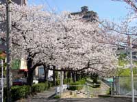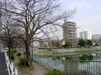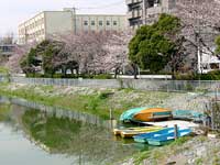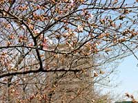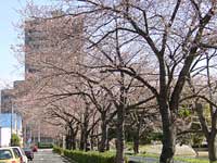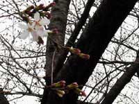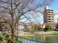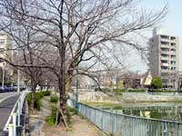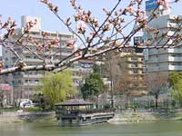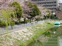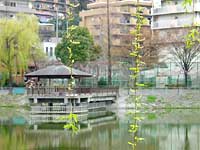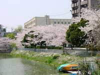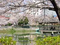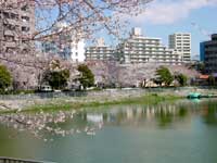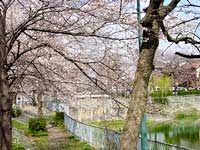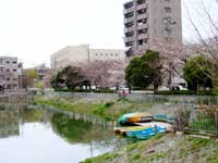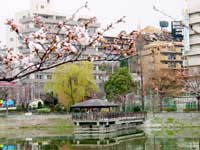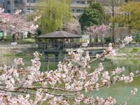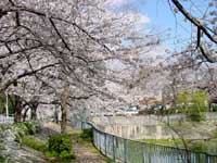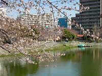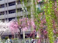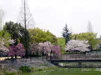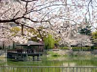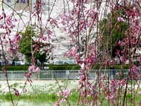 染井吉野にやや遅れて、池の外周を色の濃い枝垂さくらがアクセントをつける