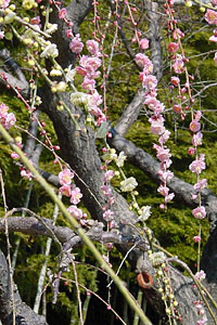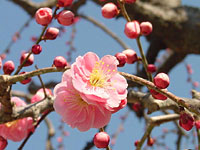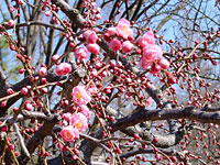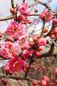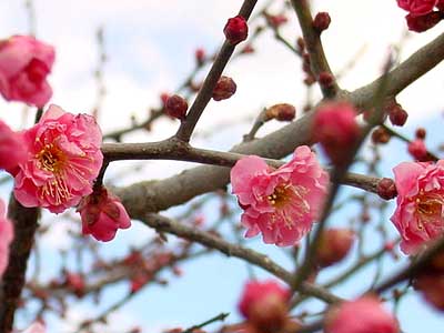 2002年2月1日:東谷山フルーツパークで紅梅が咲き始めていました。春まじか