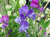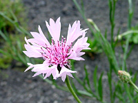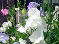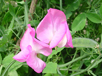 近所の駐車場のアスファルトの隙間に咲く可憐なアザミ(?)とスイトピー