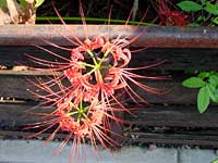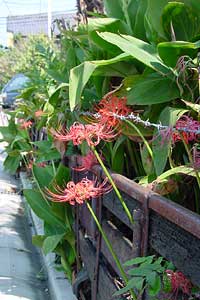 2002年10月2日:台風一過の山崎川周辺の秋。ケイトウ、彼岸花、にら坊主、カラタチの実、クレマチスなど。