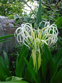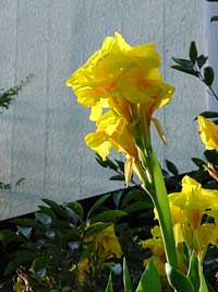 2003年8月1日:なんとか名古屋の夏(蒸し暑いうえに風が無い)らしくなりました。今年は異常気象ですが山崎川沿いの花達は元気です。オシロイバナ・マツヨイグサ・ニラの花・カンナ・熱帯植物の花・?。昭和区にて