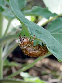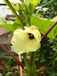 日:セミの抜け殻の両脇にキキョウとオクラの花。名東区の家庭菜園にて