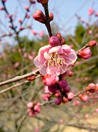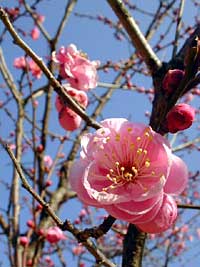 2004年2月12日:紅梅は結構咲き出したが、白梅はあわてんぼーのみ。でも、つぼみも大分ふくらんで、一斉に咲き出すのももうすぐ。