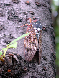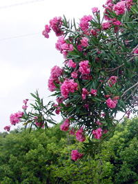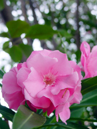 2004年8月1日:台風10号明け、曇時々晴れ、風強し。子供が夢中で追いかけるアブラゼミと夏の花キョウチクトウも今がさかり。瑞穂グラウンド東の森にて