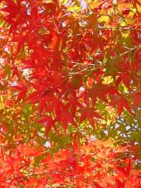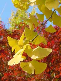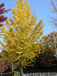 2004年12月1日:今年はやはり暖冬でしょう。例年は散ってしまっているイチョウの黄葉がいま盛りです。隣のモミジも素晴らしい紅葉をみせています。昭和区南山
