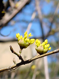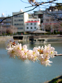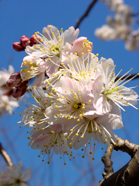 2005年3月20日:春一番の翌日は快晴。昭和区の隼人池の寒桜も満開、南山教会のサンシュユは咲き始めです。
