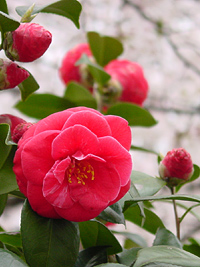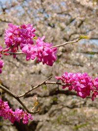 を撮りに走る。可憐な雪ヤナギに桜の若木、ツツジ、萌え出したばかりで花を持つモミジ、椿もみんな桜バックの豪華版です。