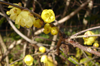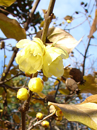 2007年1月10日:前夜のニュースでロウバイが咲いたと聞き、半信半疑で天白農業センターまで確認に行ってきました。なんという異常気象でしょう。まだ、正月の10日ですぞ。繊細な薫りに黄色の花が春を予感させる。ただし、葉っぱが付いたままで咲いているのは愛嬌でしょうか。
