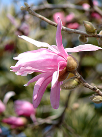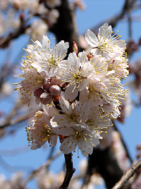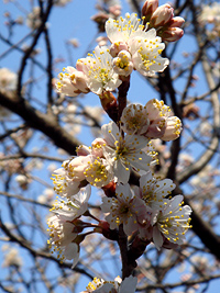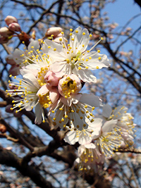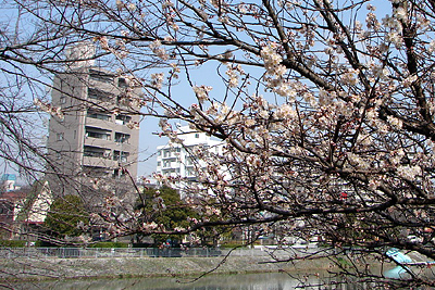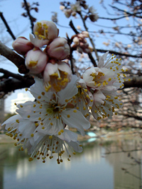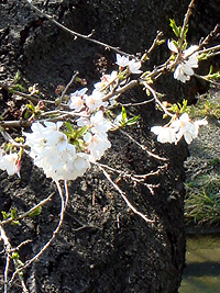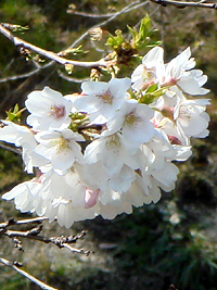 2007年3月26日:山崎川でも開花ですが胴吹の小枝か、石川橋寄りの去年の年末に植えた若木です。今週末くらいが見頃でしょう。