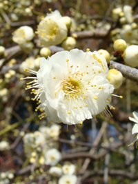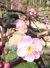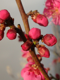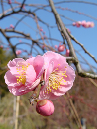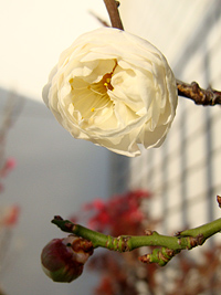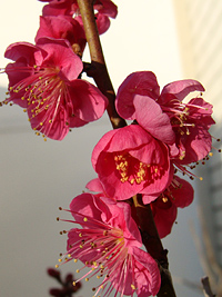 2008年2月1日:我家のベランダで紅梅の梅が咲き始めました。うららかな新春です。