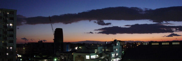 2009年12月23日:朝焼け、夕焼けの美しい季節になりました。20日午後5時20分撮影。真中の大きな建物は平和公園のアクアタワー。