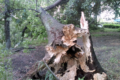 日:例年より2週間も早い梅雨入りです。アジサイを探しましたがまだまだ咲いてはいません。先日の台風2号の強風でグラウンド東の森のカエデの大木が倒れました。幹に大穴が開いてスカスカの様相でした。