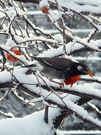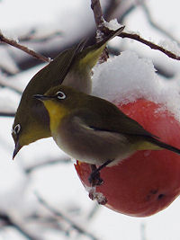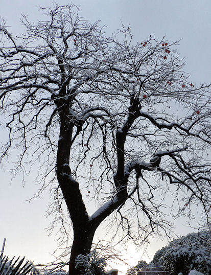 平成27年1月2日 名古屋市 今日は雪。隣の柿の木にムクドリ、メジロ、スズメなど朝食だ。