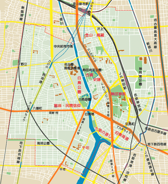 熱田神宮の摂社で承和2年(835)の創建。俗に高蔵神社と呼ぶ。祭神は高倉下命。子育ての神として知られ、6月1日の大祭は「井戸のぞき」で賑わう。境内の井戸を覗くと子供の虫封じになるという。また、金山神社は、(834)神宮鍛冶職尾崎彦四郎の祖である善光が、屋敷内に勧請したことに始まり、尾張鍛治の発祥の地といわれる。大祭は11月8日の「ふいご祭り」 |