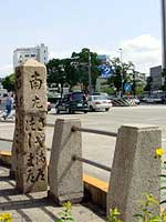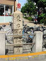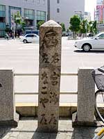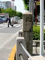 は桑名までの陸路東海道、海上の天候や、船酔い、時間の都合、女性など、旅人には 結構利用されていました。 1790年建立当時そのままであり、道標の位置は国道19号線、金山新橋の交叉点の 南西角に建っている。左(南)へ折れて"京いせ七里の渡し道",右(北)へ折れて "なごやきそ道"、さやつしま、みのち"(佐屋,津島街道,美濃)、"熱田御本社弐丁道"、と記されている。万場、神守、津島、佐屋を経て木曽川の 渡し場に至るのが佐屋街道である。