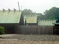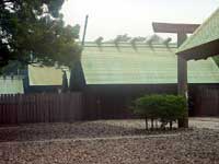 昭和20年3月・5月と2回の戦災を受けましたが、昭和30年10月に御造替されました。本宮の拝所は外玉垣御門(とのたまがきごもん)の前で、この御門と四尋殿を併せ拝殿と称し、東西翼廊を付設しています。