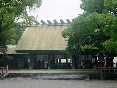 その拝殿より御垣内を拝すると、一番奥に最も高く千木・勝男木の見える社殿が「本殿」で、熱田大神はここに鎮まります。拝殿から順に「外玉垣」「内玉垣」「瑞垣」の垣があり、垣の各南正面には御門があります。内玉垣と外玉垣との間の広場を「中重」(なかのえ)といい、正面中程に立っている鳥居を中重の鳥居といいます。例祭をはじめ祭典の多くはこの中重にて斎行されます。