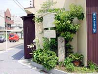 伝馬町より200メートル位で陸路東海道の西端のT字路に達します。 つきあたりの左角(東南隅)に左の写真の道標があります。 |