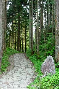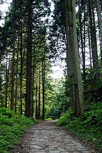 | 2003年5月29日:妻籠〜馬籠間の旧中山道。山中の細道に往時の旅人達の心細さ「木曽路はみんな山の中」を実感しました。山道を抜け、宿場に着いた時の安堵感までが偲ばれます。往時の街道をトレッキングする人も見かけました。 |