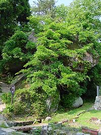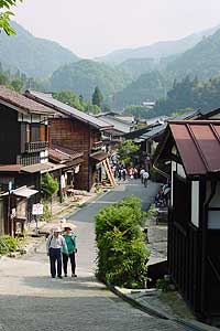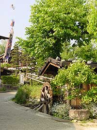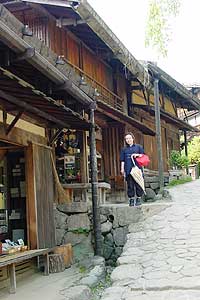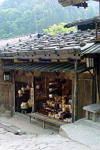 | 2003年5月29日:妻籠は鯉岩・水車・高札と入り口から期待させます。社会見学か小学生が興味深げにウロウロしていました。 |