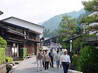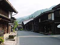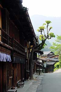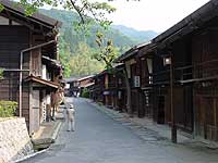 | 家並みは素朴で繊細であり、昔の旅籠そのままに出梁(だしばり)造りや竪繁格子(たてしげごうし)の家々が並びます。 |