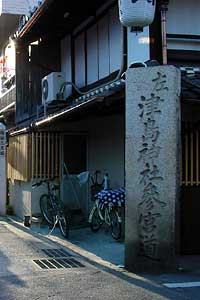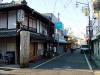 「左津島神社参宮道」と彫られた道標が、今も老舗とともに情緒を残しています。 |