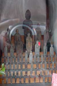 小さな地蔵堂の中に、小さな木彫りのお地蔵様が並んでいます。21cmの本尊「地蔵菩薩」を中心にして、約5〜7cmの円空独特の切れ味するどい小仏千八体が光背の形式に配置され圧巻である。5月3日に公開される。 |