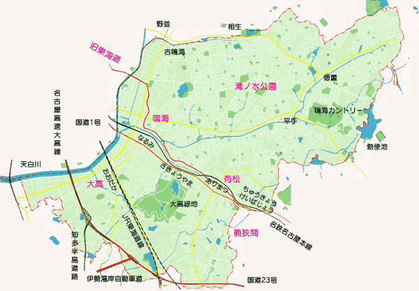 旧東海道の笠寺を東南に下り、天白川を渡り南へ歩くと東海道名所絵図にもある千鳥塚、丹下の常夜燈が迎えてくれる鳴海の町だ。東海道五十三次の宿場町として発展した鳴海の町並みは、旧東海道をはさんで、南に扇川、北の丘陵地帯に史跡や寺社があり、今も昔の風情を残している。左京山を過ぎるとやがて有松の街並。有松は旧東海道の鳴海宿と池鯉鮒宿との間に位置し、茶屋集落(間の宿)として有松絞とともに発展したところであり、今も昔のたたずまいを残している。織田信長の全国区進出のターニングポイントとなった桶狭間とは目と鼻の位置である。 |