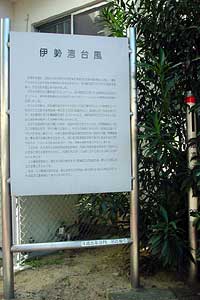 昭和34年9月26日午後9時頃、名古屋市を襲った伊勢湾台風(15号)は、市域の36%を濁流に巻き込み、1,851人の尊い命を奪い去った。市内に無残な傷跡を残した伊勢湾台風をいつまでも忘れないようにと、浸水位を記録として残したものである。(中川小学校内) 写真左の右隅の金属棒の赤い線のところまで浸水した。