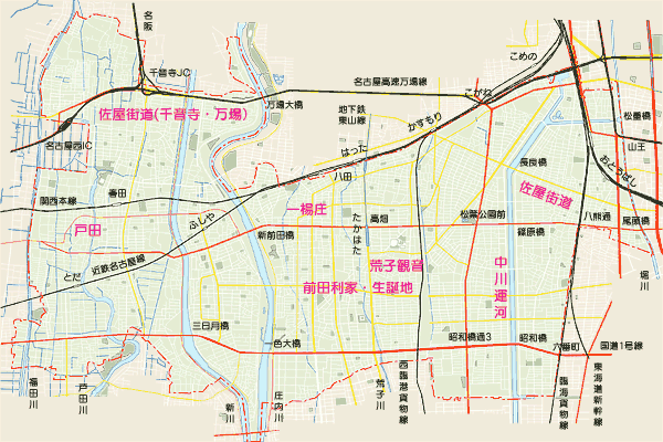 戦国武将・前田利家の生地は尾張国前田村の荒子城、庄内川を西に渡ると前田一族の本拠地があり、正室「まつ」は沖ノ島(愛知県七宝町)で生まれた。 |