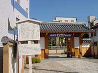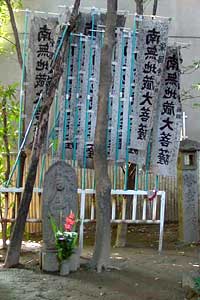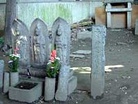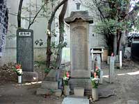 このあたりは千本松原と言われた刑場で、キリシタン弾圧の際、切支丹宗徒207名が処刑された所。1665年に元刑場で在った所に菩提を弔うため尾張藩主2代目光友が創建。のち栄国寺と改められた。寺内には佛足石、千人塚、釈迦如来立像、切支丹遺跡博物館などがある。千人塚は日当たりの悪い奥まった場所にあり、一層の哀れをさそう。石碑にかすかに十字が確認できる。 |