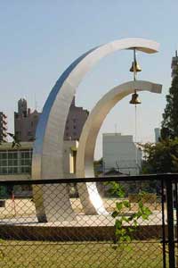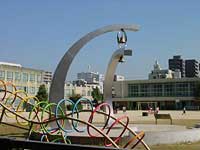 杉原千畝の平和の鐘。第二次大戦の時、ナチスから迫害を受けるユダヤ人に人道的立場でパスポートを与え続けた外交官「杉原千畝」が、税務署長であった父君の転勤で当地の平和小学校を卒業した事を記念して、「平和の鐘」が校庭に設置された。