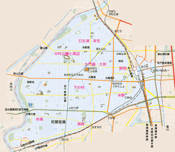 巨大なビルが林立し、賑やかな都会の合間に、今なお息づく昔の面影。古いものと新しいものの調和を楽しみながら、戦前・戦後を通じた大繁華街に歴史を見る。再開発でイメージ一新の駅西と地名に荘園時代の名残りをみる栄生・日比津と米野 |