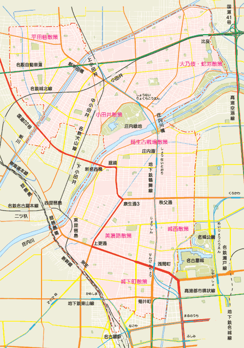 お城から見て北西に広がり、名古屋城との関係の深い史跡が多く残ります。新しい魅力である堀川緑道や城北緑道の花木に親しむというのも特色で、美濃路とも接続している。 |