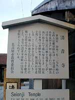 平安時代末期、太政大臣藤原師長が平清盛の怒りに触れ尾張国愛知郡井戸田村に配流の身となった。師長は琵琶の名手で朝な夕べに京を偲んで弾じたと言う。後に出家して妙音院と号したがこれが今の昭和区妙音通の地名の由来だという。師長が帰京を許され土器野の里、今の清音寺あたりかまで見送った村長の娘と悲しい別れとなった。形見として薬師如来と白菊の琵琶を残したが、娘は別れを悲しみここで身を投じたという。その後この地を琵琶島(現在は枇杷島1丁目から5丁目)と名付け、娘の菩提を弔うためこの寺を建立した。今もこのあたりに白菊町,琵琶里町のバス停がある。 |