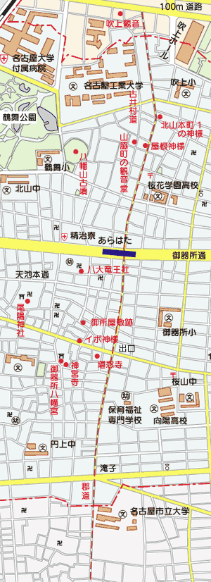 吹上、北山、荒畑、御器所、滝子と歩いてみると、古きよき時代の足跡や時代の先取りが所々にみられます。名古屋のまん中で昭和区の西部を南北に縦断し、南端は東海道の呼続(南区)、北端は飯田街道の古井坂(千種区)に通じている道です。