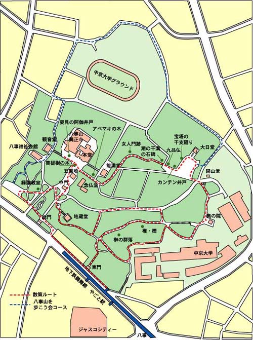 興正寺公園を出発点に、東は中京大学キャンパス、北はグラウンドの外周をめぐり、マンション群をながめながら峰々をまわり、公園に戻る3.5Kmのコースです。 |
